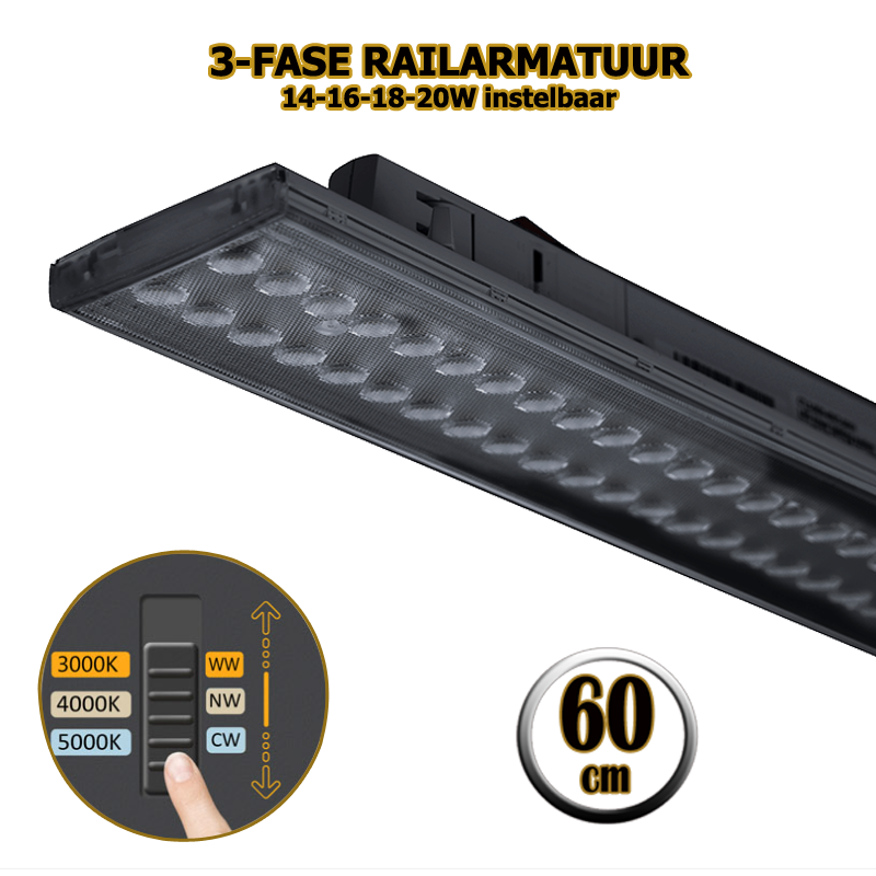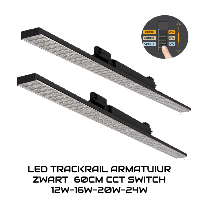Gebruik efficiënte verlichting in het magazijn, een schoolgebouw of showroom met deze 3-fase railarmatuur. 3-FASE RAILARMATUUR | TARVOS | 60CM | ZWART | CCT SWITCH. Een 3-fase railarmatuur is makkelijk te verplaatsen en kan eenvoudig op een andere rail worden bevestigd. Zo verplaats je lampen eenvoudig en snel van locatie. Met de wattage switch stel de lichtintensiteit af op 14, 16, 18 of 20W. Deze TARVOS railarmatuur verspreidt het licht evenredig over de ruimte waardoor iedere hoek van een magazijn of showroom goed wordt verlicht. Driver afmetingen van het armatuur zijn 300*25*12mm.