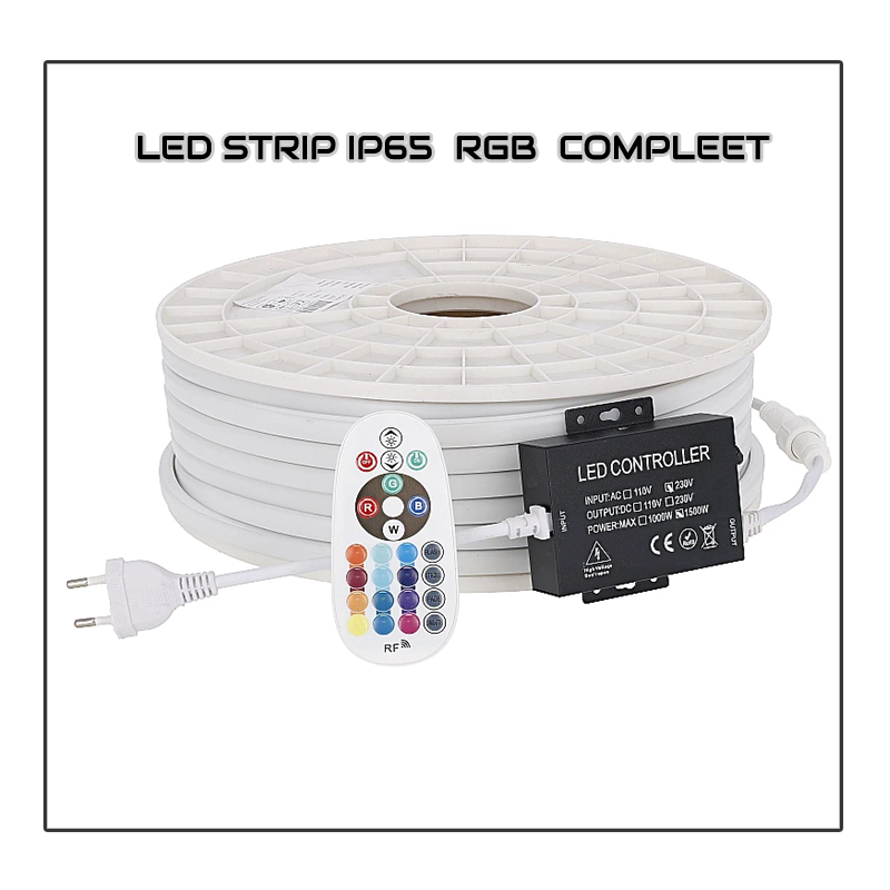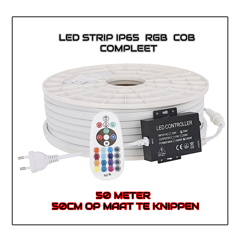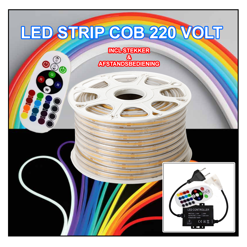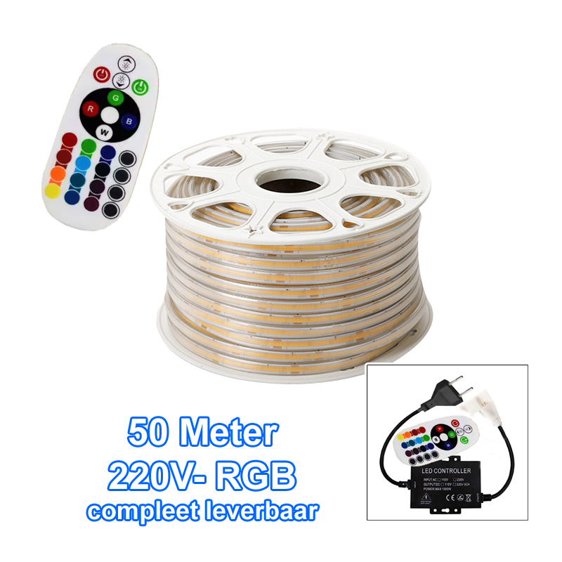 COB LEDSTRIP 220V-IP65-50 METER-RGB incl. DRIVER EN AFSTANDBEDIENING