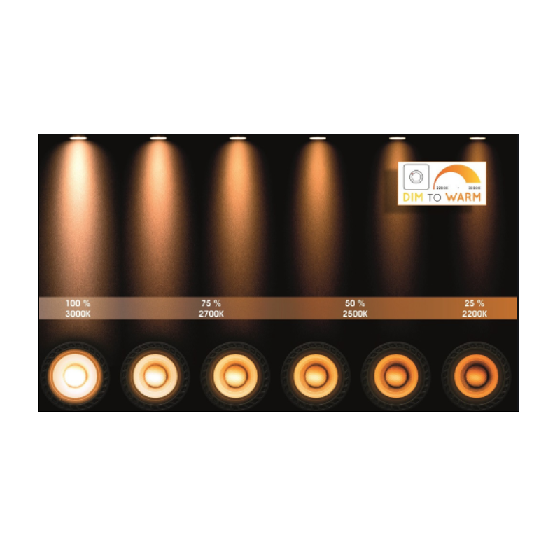 Met deze spot dim je tegelijk de lichtsterkte en de lichtkleur. Met de dim to warm techniek veranderd de kleur van het licht. De kleur van het licht wordt warmer wanneer de lamp terug wordt gedimd.